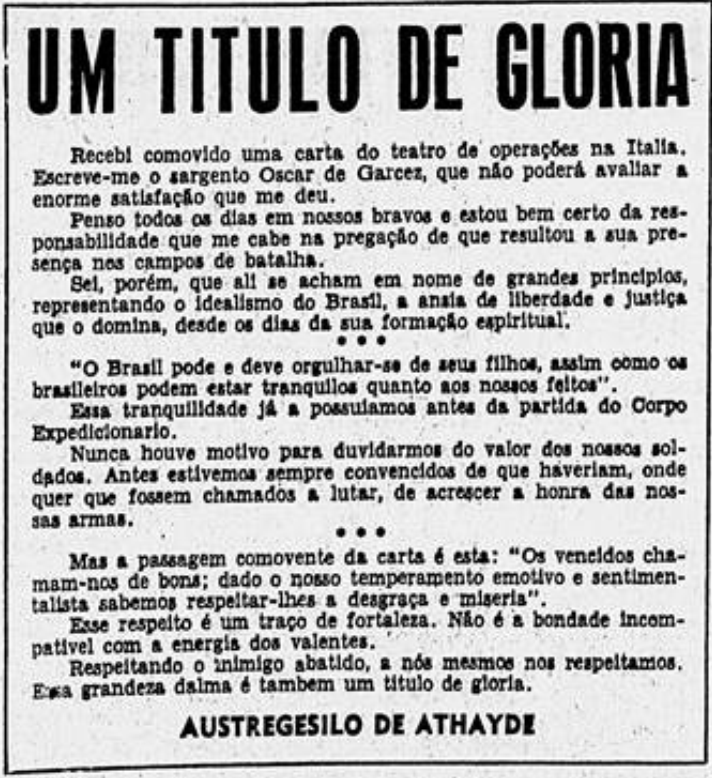Austregesilo de Athayde, que já era famoso no Rio de Janeiro na década de 40, conhecia Garcez desde 1942. Na edição de 20 de novembro de 1944, ele havia publicado uma carta que recebera do amigo servindo na Itália. A Carta dizia: “o Brasil pode e deve orgulhar-se de seus filhos, assim como os brasileiros podem estar tranquilo quanto aos nossos feitos”. Já, outro trecho descrevia que “os vencidos chamam-nos de bons; dado nosso temperamento emotivo e sentimental, sabemos respeitar eles na desgraça e miséria”.